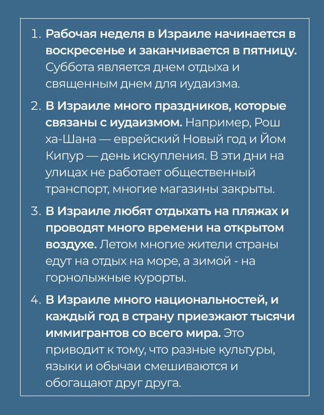 - Во-вторых, Израиль является домом для большого количества русскоязычных иммигрантов, что создает комфортную обстановку для новых жителей, которые могут найти друзей и единомышленников в новой стране.